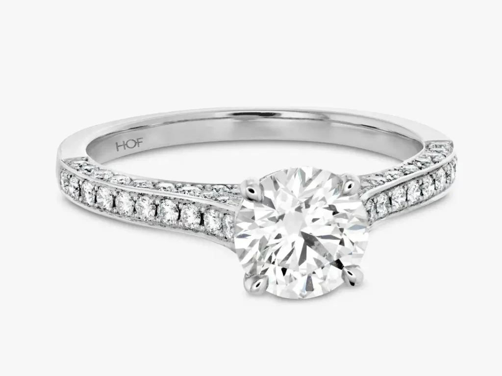 Pave (pronounced pah-vay) is a French word that means “paved.” Rings with pave bands look like they’ve been paved with diamonds—there is little visible metal, meaning maximum visible sparkle.