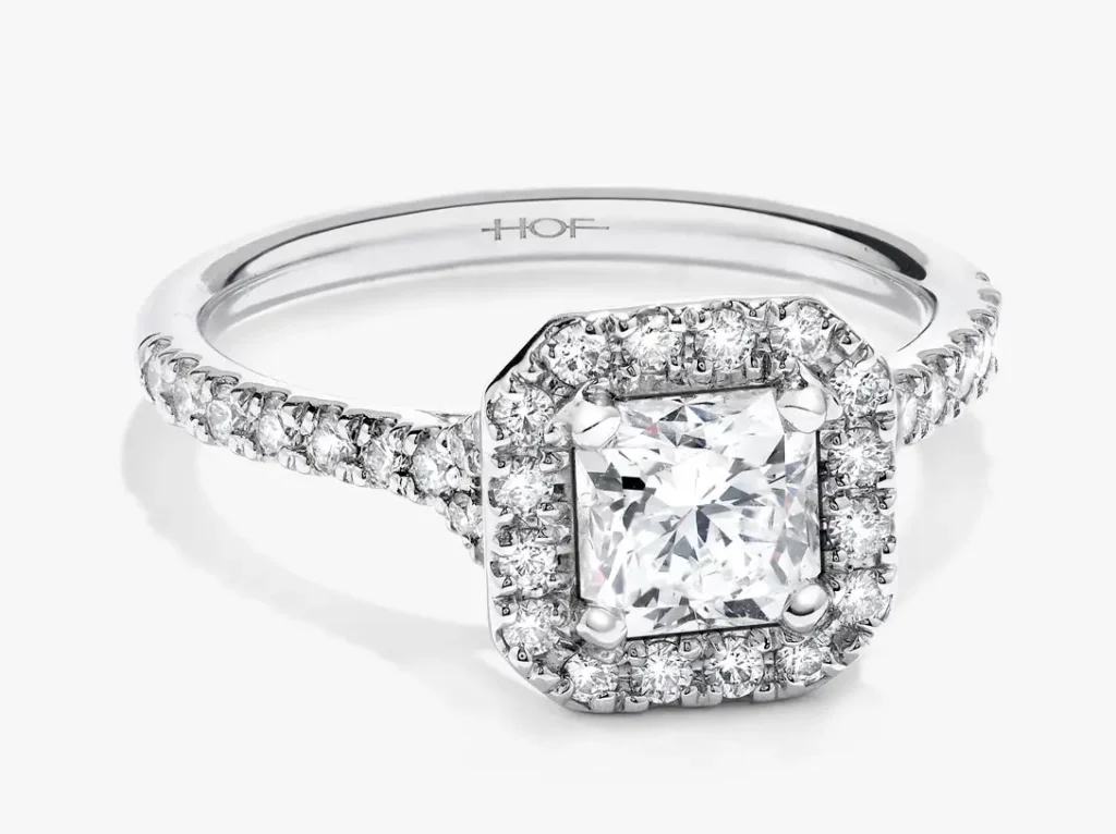 A halo ring features a center diamond surrounded by a circle of smaller diamonds. A bold style that stands out in a stack.