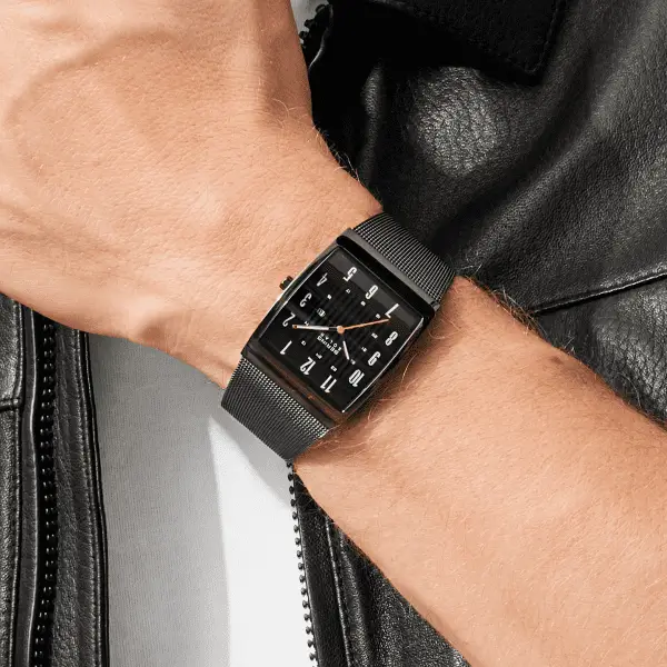 Clear lines, modern energy – a design classic reinterpreted. This men’s watch from the BERING Solar Collection impresses with its striking tonneau shape, reinterpreting the brand’s minimalist design with elegance. The deep black dial with white Arabic numerals ensures excellent readability, while an orange seconds hand and a discreet date window at three o’clock add a dynamic touch. The glossy grey stainless steel case measures 44 mm in length and only 8 mm in height – modern, slim, and comfortable on the wrist. The grey Milanese strap with fold-over clasp continues the clean design and offers exceptional wearing comfort. At its heart, a solar movement charges from sunlight or artificial light and runs reliably for months without the need for a battery change. Domed sapphire crystal protects the dial from scratches, while 3 ATM water resistance makes it a stylish companion for everyday life.